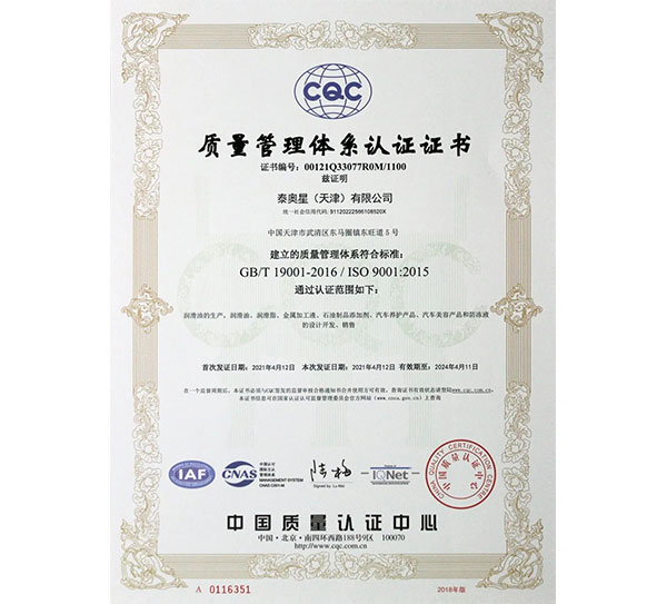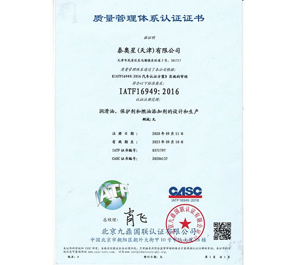 泰奧星(天津)有限公司的IATF16949:2016認(rèn)證證書
