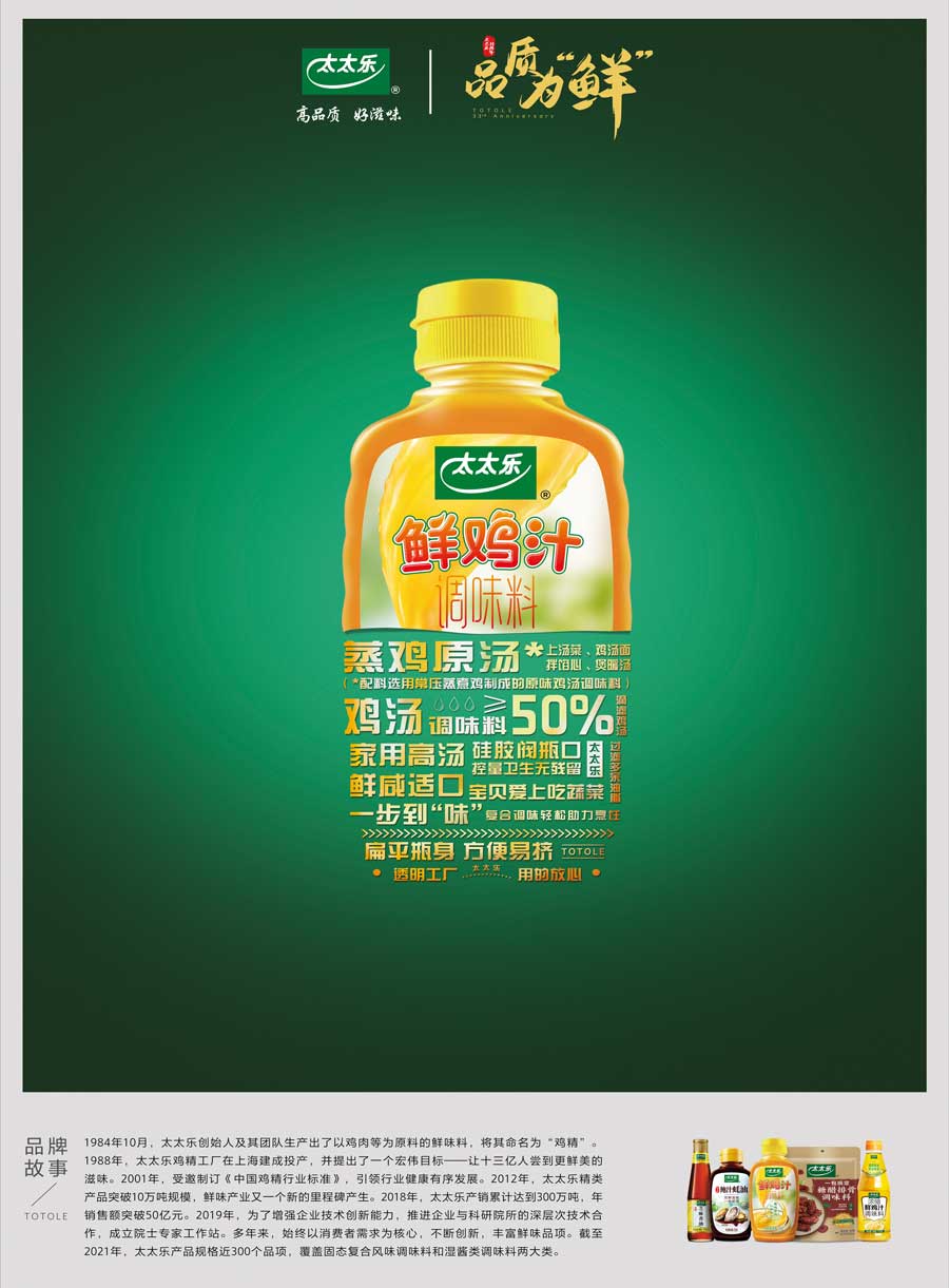 太太樂產(chǎn)品覆蓋固態(tài)復(fù)合風(fēng)味調(diào)味料和液態(tài)增鮮調(diào)味料兩大類的不同系列,多個子品牌,產(chǎn)品規(guī)格近300個品項。太太樂憑借雀巢體系的國際化管理體制、全球化質(zhì)量監(jiān)管體系、強(qiáng)大的研發(fā)實力和卓越的員工團(tuán)隊,依托以餐飲、零售、電商、出口為主的四大銷售渠道,銷售網(wǎng)絡(luò)覆蓋全國各地,并出口至美國、加拿大、日本、中東等國家和地區(qū)。作為鮮味科學(xué)倡導(dǎo)者,太太樂以“讓十三億人嘗到更鮮美的滋味”為企業(yè)愿景,持續(xù)鮮味行業(yè)革新升級。