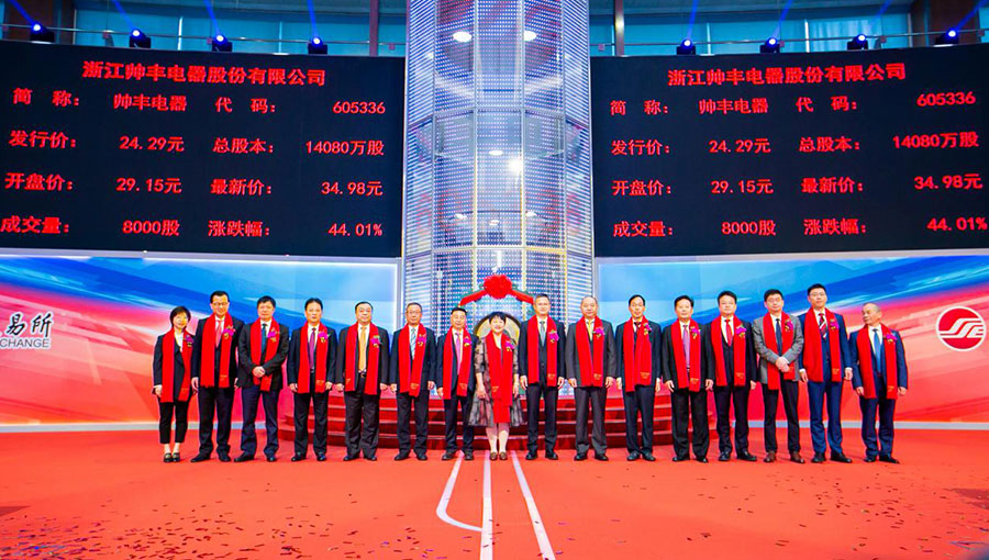 帥豐電器于2020年10月19日在上交所掛牌敲鑼,成為集成灶板塊首家上交所A股主板上市企業(yè)(證券簡稱:帥豐電器,證券代碼:605336.SH)。