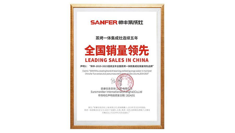 帥豐電器立足用戶需求進行集成灶產(chǎn)品的迭代升級,從消毒柜款、單獨烤箱款、蒸箱款集成灶,到蒸烤一體款,再到蒸烤同步款,不論是在產(chǎn)品功能還是技術性能上,帥豐電器都處于行業(yè)領先水平,根據(jù)歐睿國際調研數(shù)據(jù)顯示,帥豐蒸烤一體集成灶2019年-2023年連續(xù)5年全國銷量領先。