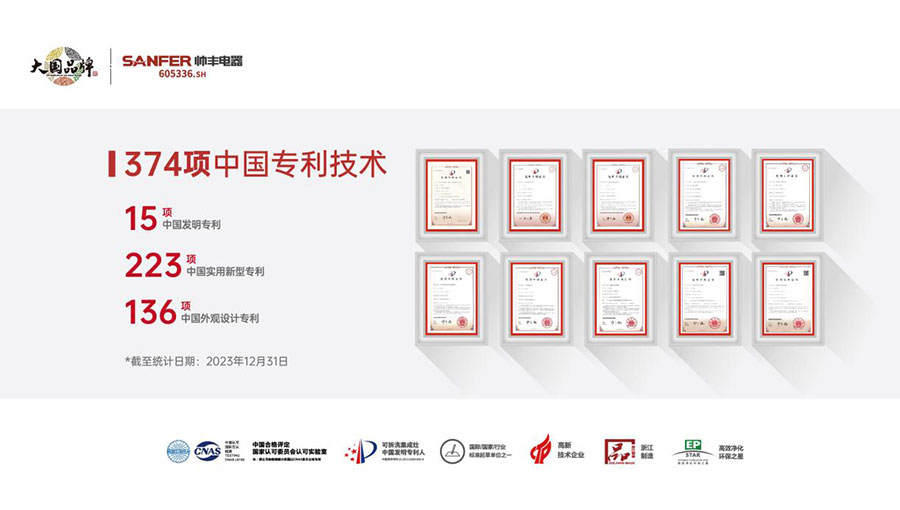 自2005年組建團隊研發(fā)集成灶產(chǎn)品開始,帥豐電器在集成灶領域不斷深耕,截至目前,帥豐電器及其子公司合計擁有專利374項,其中發(fā)明專利15項,實用新型專利223項,外觀設計專利136項,在集成灶煙機風道系統(tǒng)、燃燒器系統(tǒng)、蒸烤箱系統(tǒng)等核心系統(tǒng)的技術性能上,擁有自主知識產(chǎn)權,且多項系統(tǒng)的性能指標領先于行業(yè),直流變頻斑彩螺風道系統(tǒng)擁有13項專利認證,增強風壓效果,優(yōu)化油煙系統(tǒng),油煙吸凈率99.96%行業(yè)領先;同時,擁有10項改善和降低噪聲的專利認證,消除了置于人體頭部的噪聲源,工作噪聲遠低于國家規(guī)定的上限值且優(yōu)于行業(yè)平均水平;還有帥豐與浙工大聯(lián)合研發(fā)的koms廚房全局監(jiān)控系統(tǒng)——帥豐第十項發(fā)明專利,擁有智慧烹飪、健康提醒、安全防護3大科技功能。