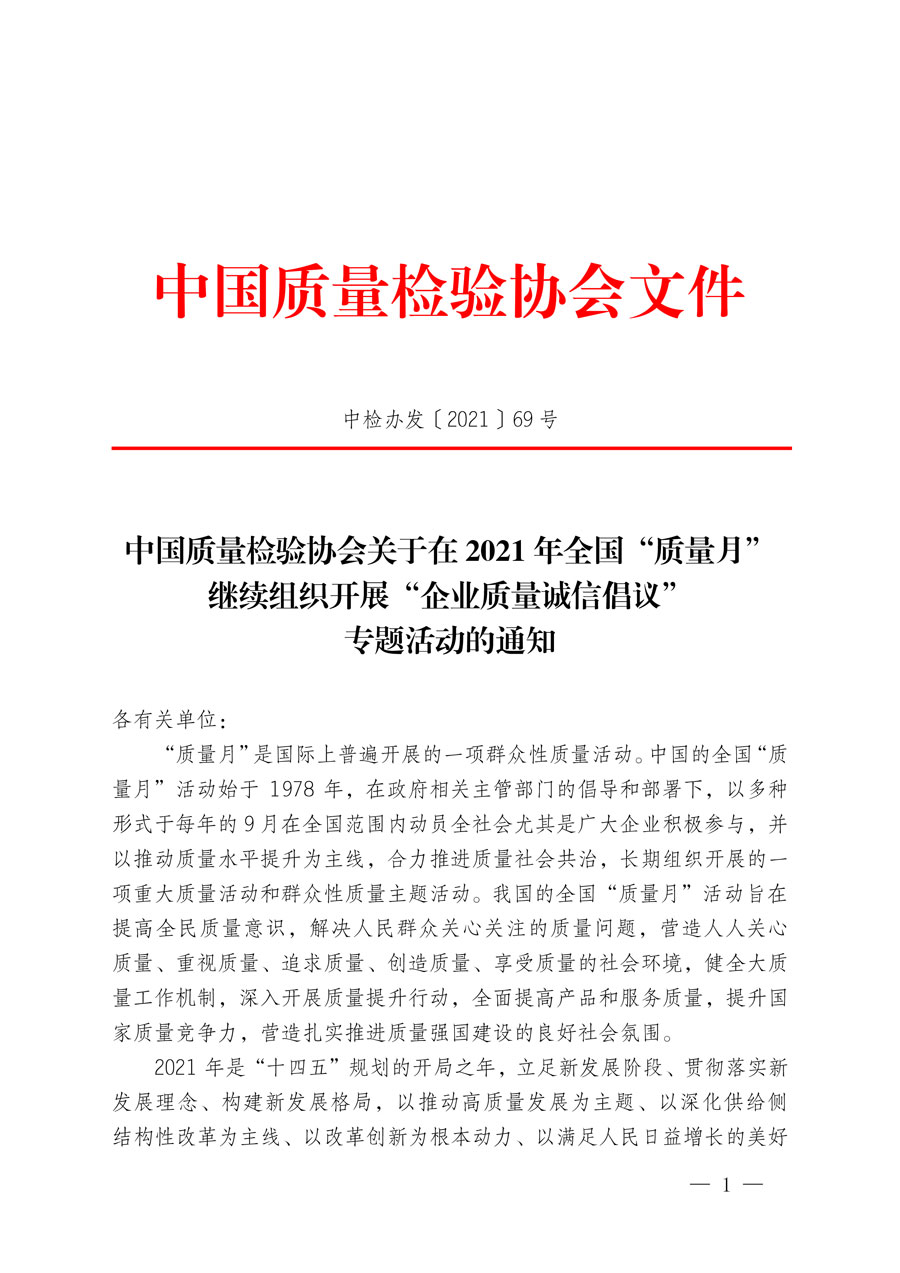 中國(guó)質(zhì)量檢驗(yàn)協(xié)會(huì)作為我國(guó)質(zhì)量檢驗(yàn)行業(yè)組織和質(zhì)量專業(yè)社團(tuán)機(jī)構(gòu),積極響應(yīng)2021年全國(guó)“質(zhì)量月”活動(dòng)部署,切實(shí)運(yùn)用“質(zhì)量月”活動(dòng)的平臺(tái)影響力,充分發(fā)揮推動(dòng)全社會(huì)質(zhì)量共治的橋梁紐帶作用,全面樹立質(zhì)量標(biāo)桿,大力弘揚(yáng)工匠精神,全力營(yíng)造質(zhì)量誠(chéng)信社會(huì)氛圍,努力服務(wù)高質(zhì)量發(fā)展,謹(jǐn)此組織各行各業(yè)在質(zhì)量提升、質(zhì)量責(zé)任、質(zhì)量安全、質(zhì)量誠(chéng)信、質(zhì)量發(fā)展、質(zhì)量創(chuàng)新等方面具有良好示范作用的1600家優(yōu)秀企業(yè)共同發(fā)出《2021年全國(guó)“質(zhì)量月”企業(yè)質(zhì)量誠(chéng)信倡議書》。
