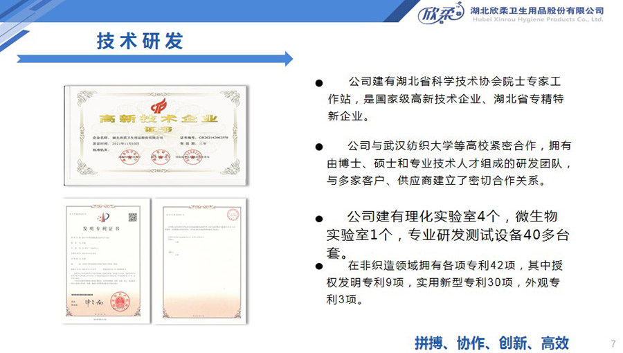 欣柔是以一次性醫(yī)衛(wèi)及生活用非織造材料為主導(dǎo),同時(shí)集生產(chǎn)銷(xiāo)售醫(yī)衛(wèi)用脫脂纖維和擦拭類(lèi)終端產(chǎn)品的高新技術(shù)企業(yè),欣柔秉承“人才為本,科技領(lǐng)先,用戶至上”的經(jīng)營(yíng)理念,努力打造成為一家以研發(fā)創(chuàng)新為驅(qū)動(dòng)力,以功能型、差異化產(chǎn)品為牽引力的專業(yè)醫(yī)衛(wèi)用非織造材料供應(yīng)商及生活用品提供商。