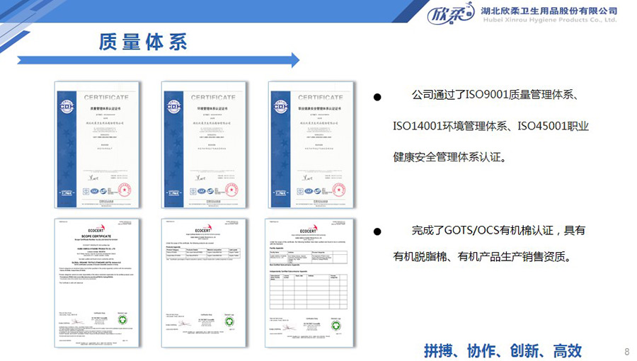 欣柔通過(guò)了ISO9001質(zhì)量管理體系、ISO14001環(huán)境管理體系、ISO45001職業(yè)健康安全管理體系認(rèn)證。完成了GOTS/OCS有機(jī)棉認(rèn)證,具有有機(jī)脫脂棉、有機(jī)產(chǎn)品生產(chǎn)銷(xiāo)售資質(zhì)。