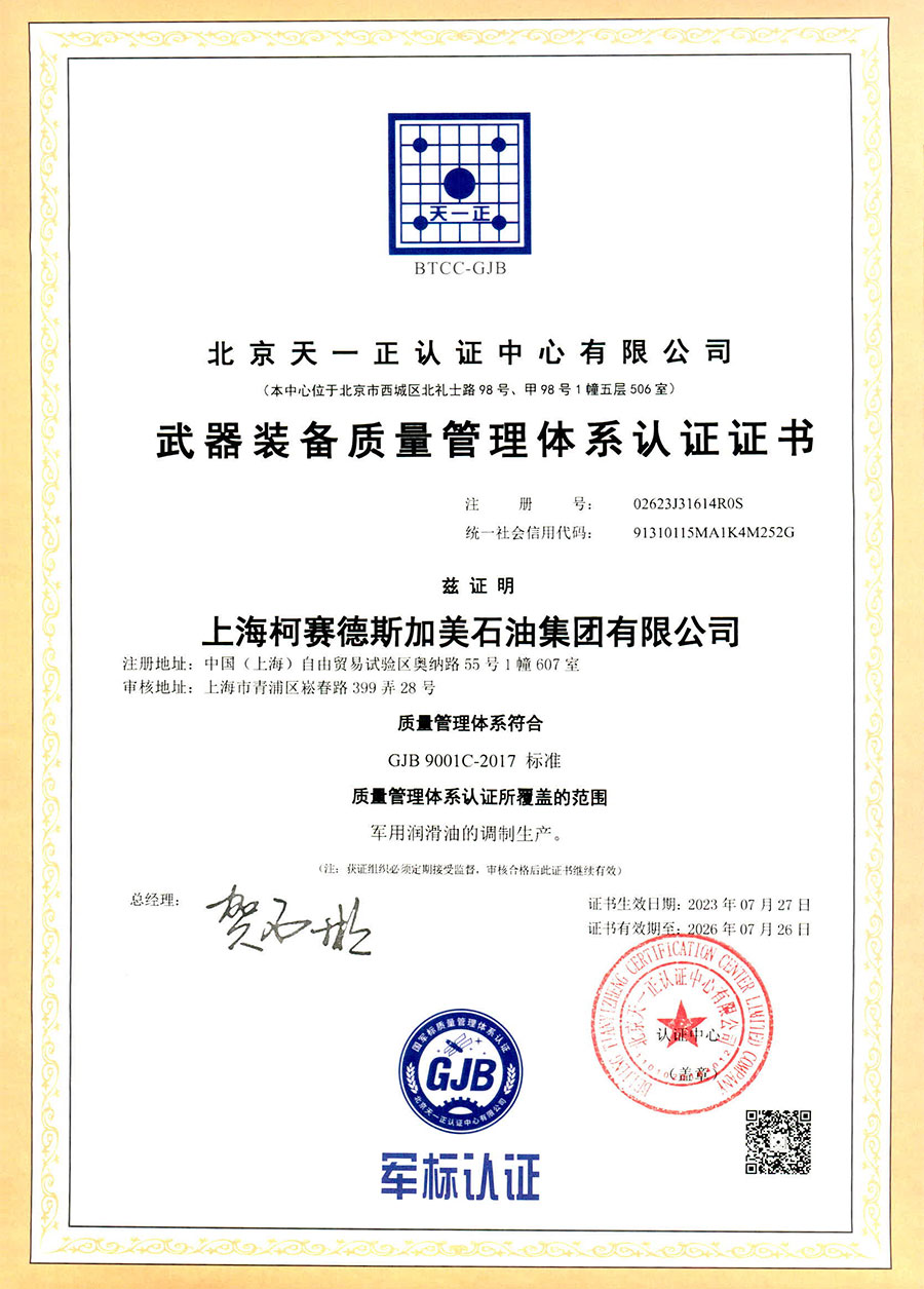 柯賽德斯集團(tuán)公司統(tǒng)一遵循嚴(yán)格的質(zhì)量保證體系,先后通過了武器裝備質(zhì)量管理體系認(rèn)證GJB9001C-2017、ISO/TS16949、IS09001質(zhì)量體系認(rèn)證、1S014001環(huán)境體系認(rèn)證及ISO45001:2018職業(yè)健康安全管理體系認(rèn)證。隨著業(yè)務(wù)領(lǐng)域的不斷擴(kuò)展,目前柯賽德斯集團(tuán)公司先后與多家世界能源、化工方面的巨頭建立了產(chǎn)品服務(wù)、供應(yīng)保障、技術(shù)合作、技術(shù)特別支持單位等方面的戰(zhàn)略合作關(guān)系。今天,柯賽德斯集團(tuán)公司旗下管理著三大潤(rùn)滑油品牌,實(shí)現(xiàn)了經(jīng)營(yíng)上的多元化戰(zhàn)略格局。