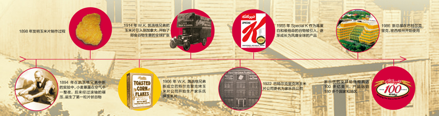 一百多年來,家樂氏公司秉承“更健康、更營(yíng)養(yǎng)美味和更高質(zhì)量”的信念以及“天然和優(yōu)質(zhì)”的高尚品質(zhì),不斷地推陳出新,先后推出系列經(jīng)典 產(chǎn)品如All-Bran®(1916年)和 Rice Krispies®(1928年)。隨著業(yè)務(wù)的發(fā)展,家樂氏公司開始拓展國(guó)際業(yè)務(wù):1914年Kellogg’s Corn Flakes®產(chǎn)品進(jìn)軍加拿大市場(chǎng),1924年和1938年分別在澳大利亞的悉尼、英格蘭的曼徹斯特設(shè)立工廠。2007年,家樂氏成功進(jìn)入中國(guó),并以銷售額接近120億美金的業(yè)績(jī)成為全球谷物食品和方便食品的領(lǐng)頭者,產(chǎn)品包括谷物類早餐、餅干、克力架、糕點(diǎn)、果味小食、燕麥餅干棒、冷凍華夫以及素食產(chǎn)品等。2012年6月,家樂氏在全球成功收購(gòu)品客品牌,使家樂氏的休閑產(chǎn)品成為繼谷物產(chǎn)品之后的第二大品牌。