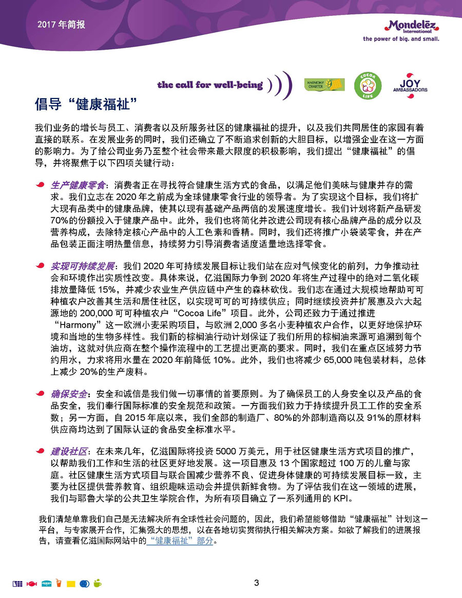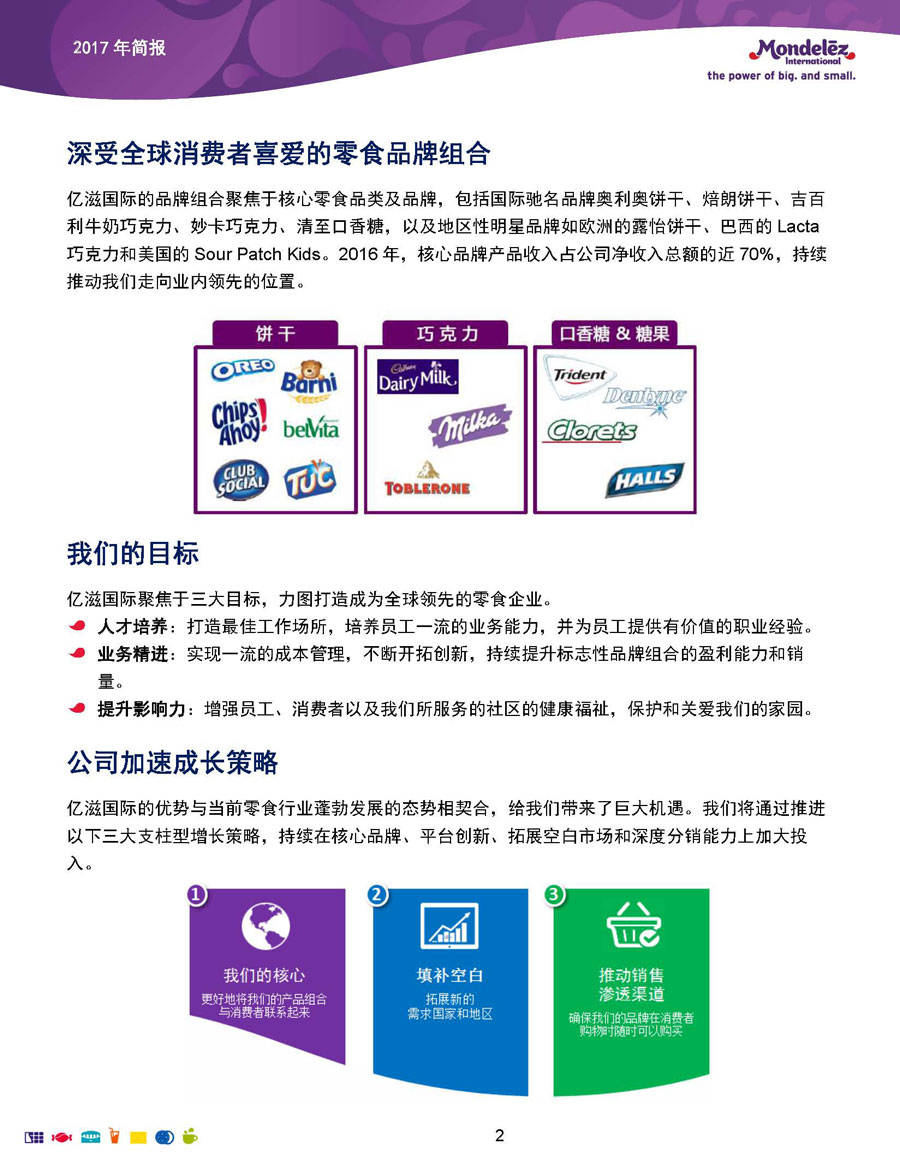 我們的目標和愿景是:打造全球領先的零食企業(yè),創(chuàng)造充滿歡樂的美味時刻。為實現(xiàn)這一愿景,公司9萬余名員工全力以赴地為全球約165個國家的消費者生產(chǎn)和提供美味的食品和飲料。