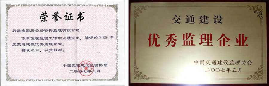由于工作業(yè)績突出,1999年公司被評為行業(yè)“九五”立功先進單位,2000年獲得“九五”全國干線公路檢查評比立功單位,2001年被評為公路系統(tǒng)文明窗口,2002年被評為行業(yè)文明創(chuàng)建達標單位,2003年至2005年被評為先進監(jiān)理單位,2006年被評為公路行業(yè)“十五”期文明服務(wù)品牌、“交通建設(shè)優(yōu)秀監(jiān)理企業(yè)”,2000年至2007年連續(xù)被評為公路局先進單位、公路系統(tǒng)文明窗口;連續(xù)八年五年獲得公路局“優(yōu)秀領(lǐng)導(dǎo)班子”的榮譽稱號。