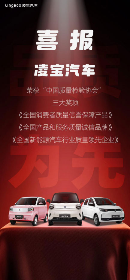 誠信為本,質(zhì)量為先。近日,凌寶汽車摘得中國質(zhì)量檢驗(yàn)協(xié)會“全國消費(fèi)者質(zhì)量信譽(yù)保障產(chǎn)品”“全國產(chǎn)品和服務(wù)質(zhì)量誠信品牌”“全國新能源汽車行業(yè)質(zhì)量領(lǐng)先企業(yè)”三項(xiàng)大獎,為今年的圓滿收官畫上了濃墨重彩的一筆。