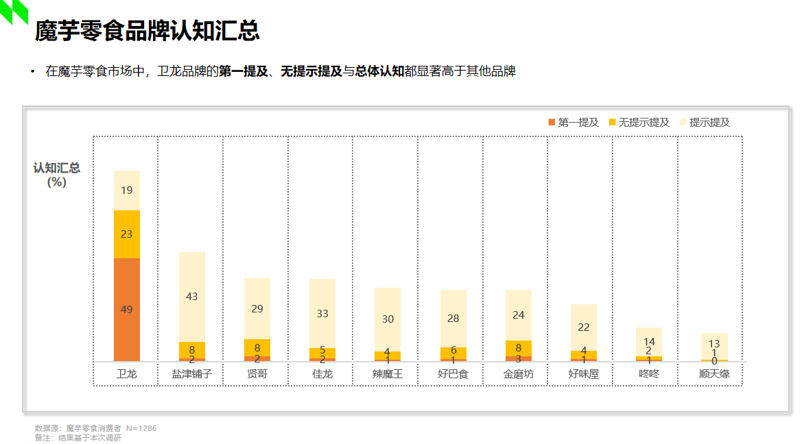 據(jù)2022年尼爾森調(diào)研顯示,在魔芋市場中,衛(wèi)龍品牌的第一提及、無提示提及與總體認(rèn)知都顯著高于其他品牌。顯然,衛(wèi)龍發(fā)明的魔芋爽在市場中已然奠定了良好且堅(jiān)固的受眾認(rèn)知基礎(chǔ),那么“小魔女”的加入,不僅進(jìn)一步充實(shí)了衛(wèi)龍自身的產(chǎn)品矩陣,占位了“魔芋素毛肚”的產(chǎn)品類目,也將引領(lǐng)魔芋休閑食品賽道邁向更高品質(zhì)的發(fā)展方向,為市場打開全新的增量機(jī)遇。