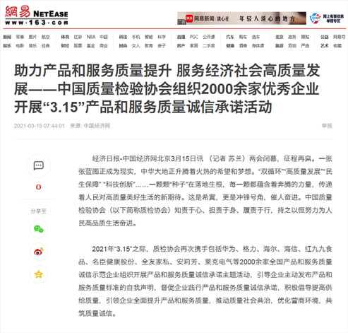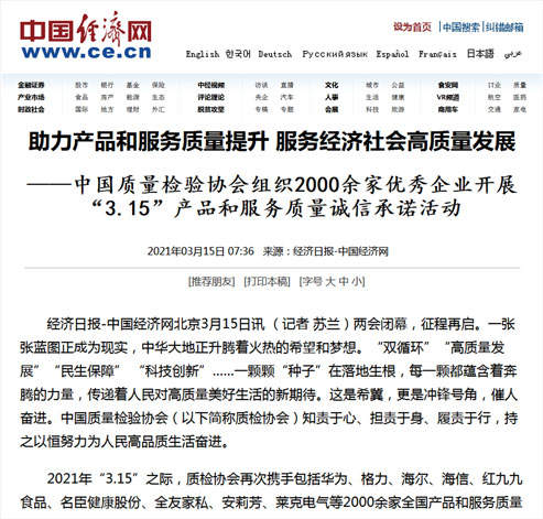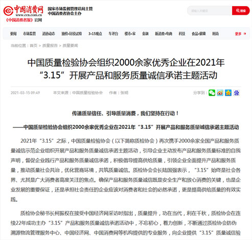 中國經(jīng)濟(jì)網(wǎng):傳遞質(zhì)量信任、引導(dǎo)質(zhì)量消費(fèi),我們堅(jiān)持在行動(dòng)!——中國質(zhì)量檢驗(yàn)協(xié)會(huì)組織2000余家優(yōu)秀企業(yè)在2021年“3.15”開展產(chǎn)品和服務(wù)質(zhì)量誠信承諾主題活動(dòng)
