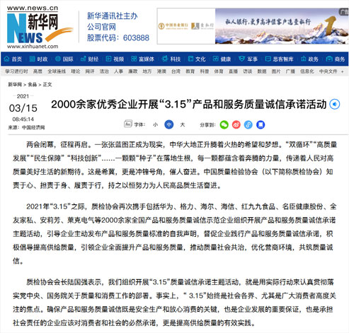 新華網(wǎng):2000余家優(yōu)秀企業(yè)開展“3.15”產(chǎn)品和服務(wù)質(zhì)量誠信承諾活動(dòng)