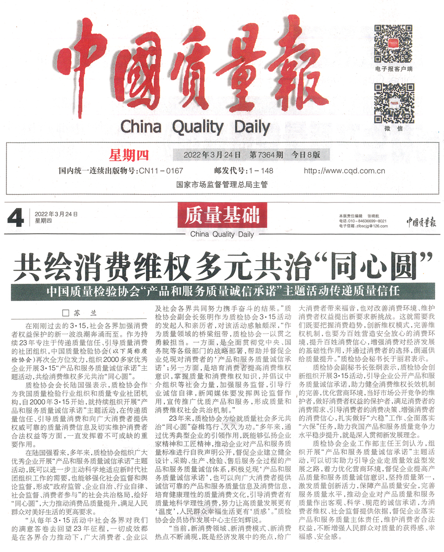 中國(guó)質(zhì)量報(bào)(3月15日刊第2版):推動(dòng)質(zhì)量共治 優(yōu)化營(yíng)商環(huán)境 共筑質(zhì)量誠(chéng)信——中國(guó)質(zhì)量檢驗(yàn)協(xié)會(huì)攜手2000余家企業(yè)組織開展“3 ·15”產(chǎn)品和服務(wù)質(zhì)量誠(chéng)信承諾主題活動(dòng)