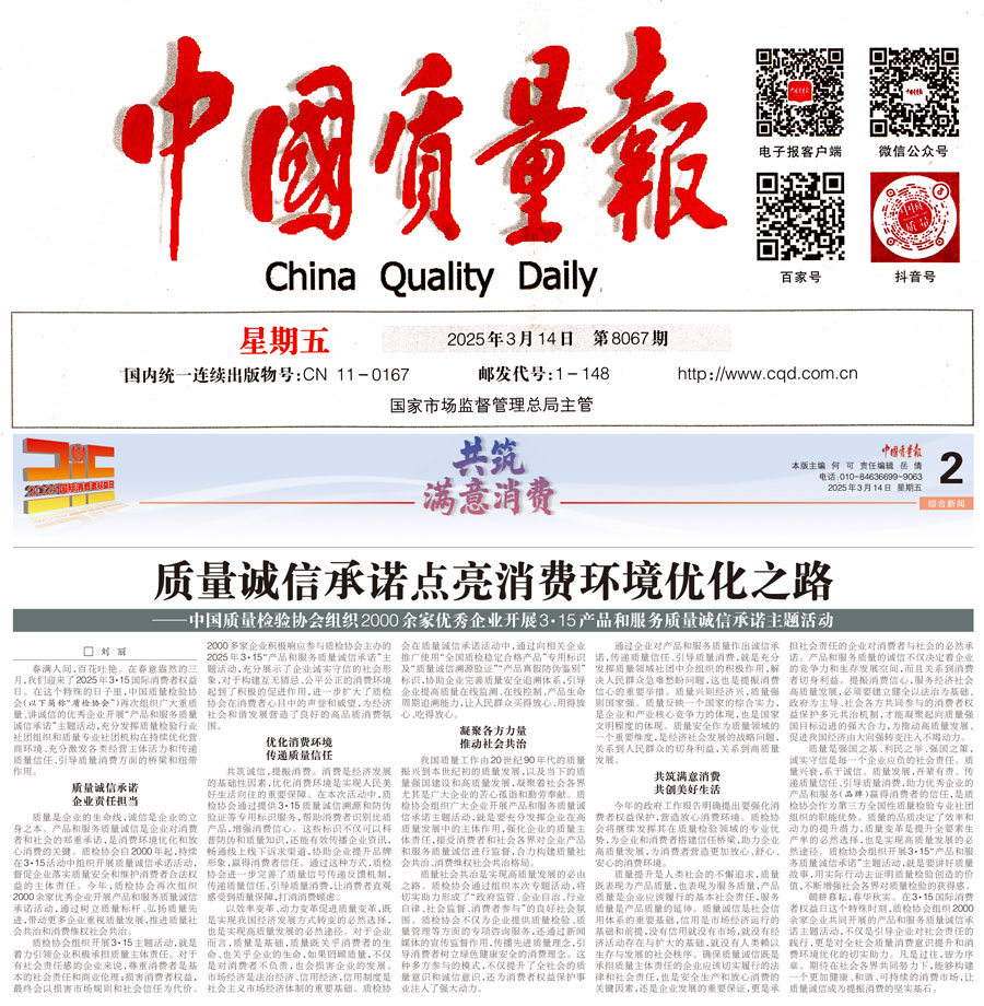 《中國質(zhì)量報(bào)》(2025年3月14日刊)發(fā)布:質(zhì)量誠信承諾點(diǎn)亮消費(fèi)環(huán)境優(yōu)化之路——中國質(zhì)量檢驗(yàn)協(xié)會(huì)組織2000余家優(yōu)秀企業(yè)開展3·15產(chǎn)品和服務(wù)質(zhì)量誠信承諾主題活動(dòng)