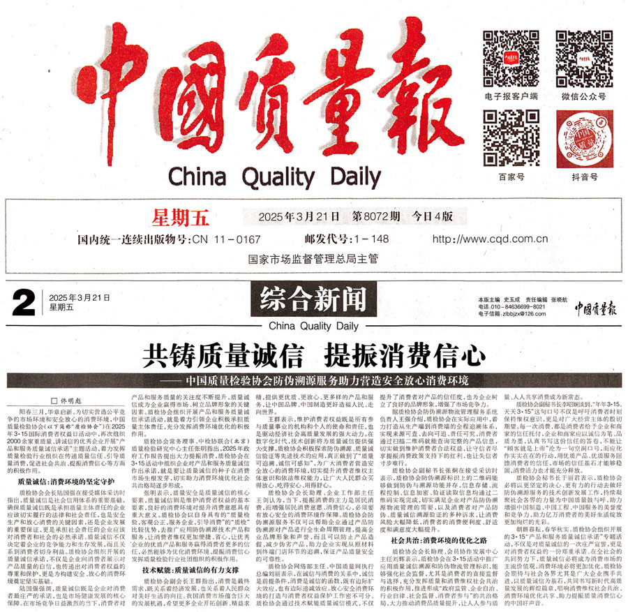 《中國質(zhì)量報(bào)》(2025年3月21日刊)發(fā)布:共鑄質(zhì)量誠信 提振消費(fèi)信心——中國質(zhì)量檢驗(yàn)協(xié)會(huì)防偽溯源服務(wù)助力營造安全放心消費(fèi)環(huán)境