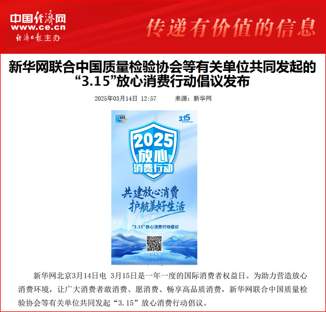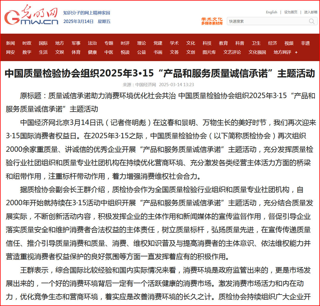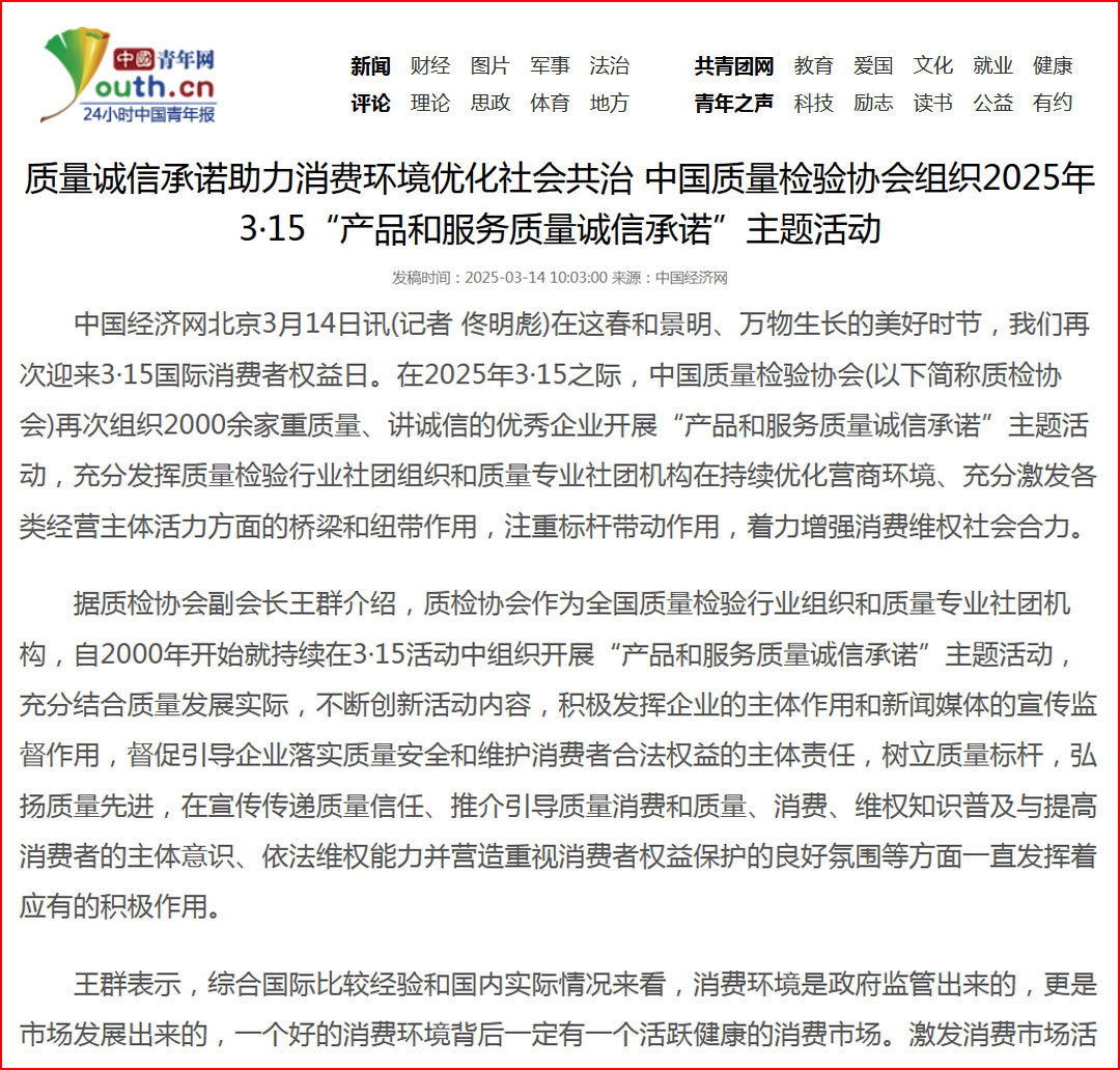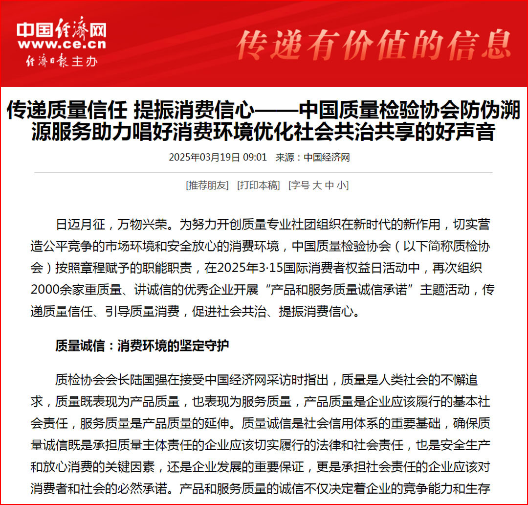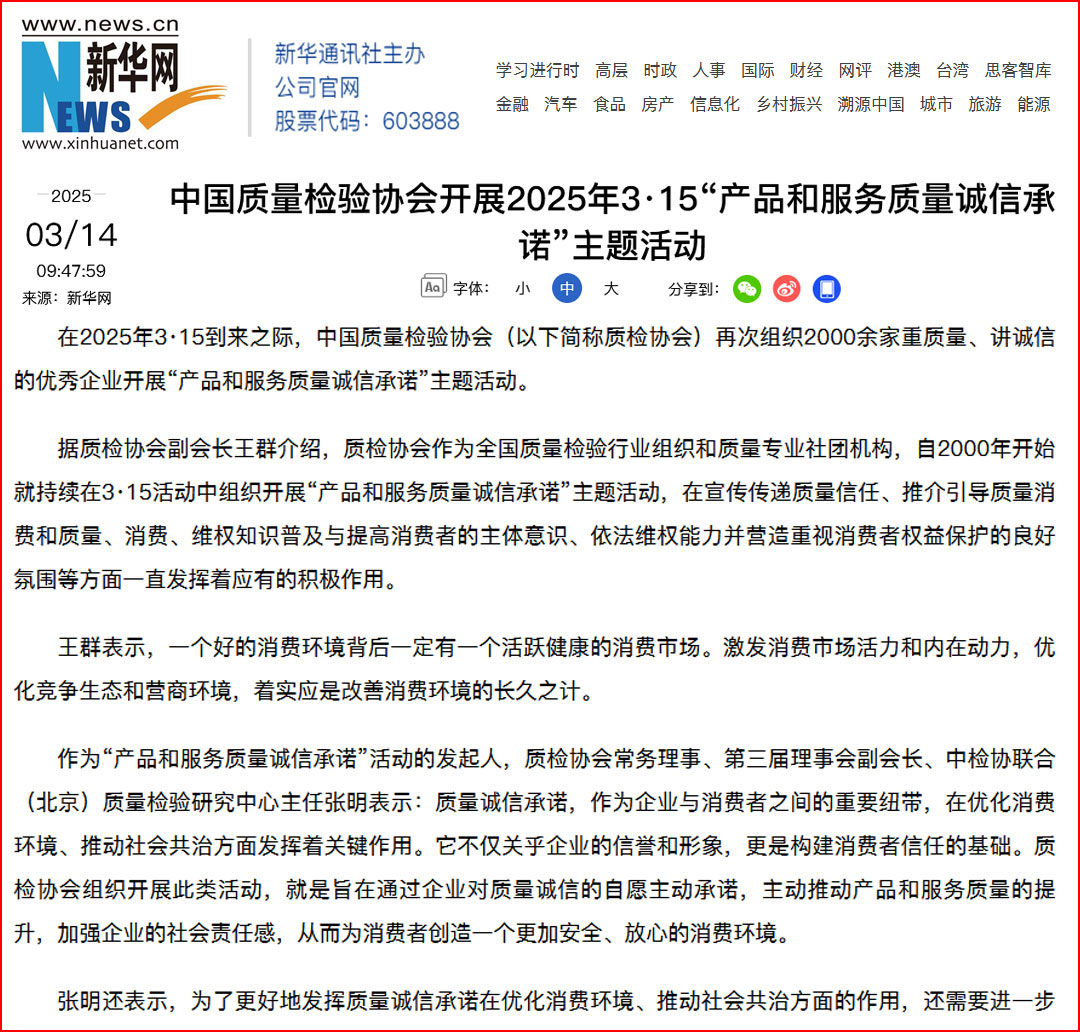 中國經(jīng)濟(jì)網(wǎng)“質(zhì)量經(jīng)濟(jì)頻道”發(fā)布:質(zhì)量誠信承諾:消費(fèi)環(huán)境和消費(fèi)維權(quán)優(yōu)化社會(huì)共治的基石——中國質(zhì)量檢驗(yàn)協(xié)會(huì)組織2000余家優(yōu)秀企業(yè)開展2025年3·15“產(chǎn)品和服務(wù)質(zhì)量誠信承諾”主題活動(dòng)