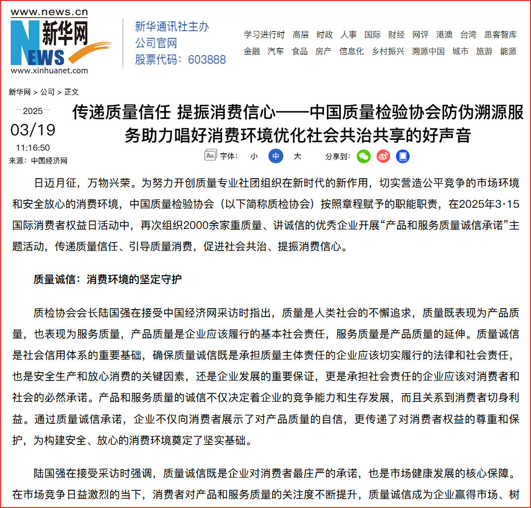 中國經(jīng)濟(jì)網(wǎng)“質(zhì)量經(jīng)濟(jì)頻道”發(fā)布:質(zhì)量誠信承諾助力消費(fèi)環(huán)境優(yōu)化社會(huì)共治——中國質(zhì)量檢驗(yàn)協(xié)會(huì)組織2025年3·15“產(chǎn)品和服務(wù)質(zhì)量誠信承諾”主題活動(dòng)
